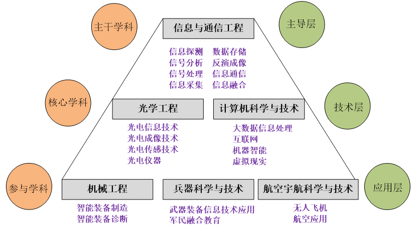 本学科群的主干学科为信息与通信工程,核心学科包括:光学工程、计算机科学与技术;参与学科包括:机械工程、兵器科学与技术、航空宇航科学与技术等学科,具体构架如图所示。