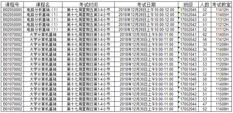 2018-2019学年第一学期第十七周校级结课考试安排