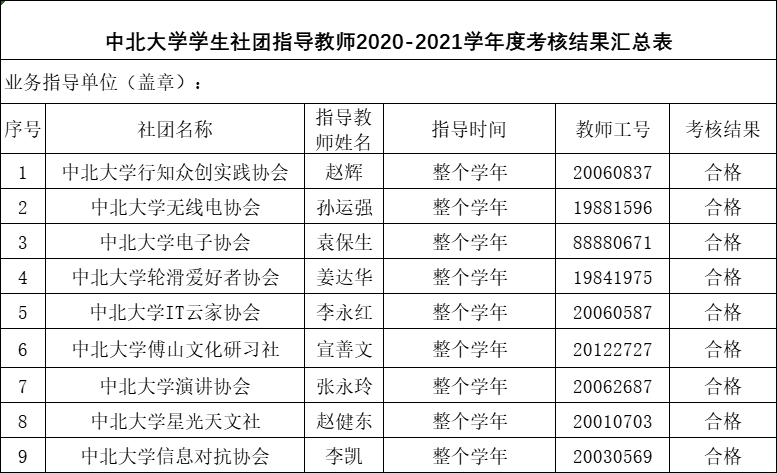为全面加强学生社团建设,明确指导教师在学生社团思想引领、社团建设、社团活动管理等工作中的关键作用,根据《中北大学学生社团管理条例》中关于学生社团指导教师有关要求,现将学生社团指导教师2020—2021学年工作考核结果公示如下: