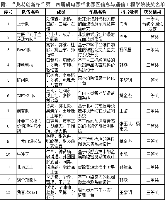2019628日“兆易创新杯”第十四届中国研究生电子设计大赛华北赛区评审会和现场赛在北京理工大学举办,共有来自41所高校的312支队伍参加角逐。我院在本次大赛中派出了15个代表队参加,获华北赛区一等奖3项,二等奖4项,三等奖6项,杨风暴教授、尚禹教授获优秀指导教师。
