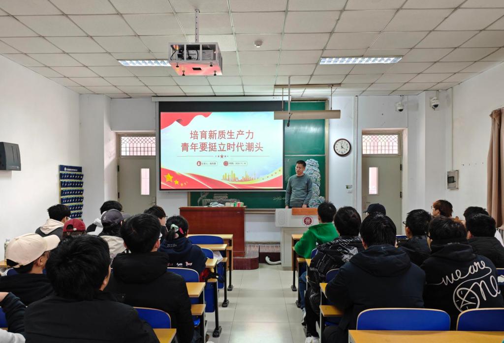 杨校长结合当前国际形势和科技发展趋势,深入剖析了新时代青年在推动新质生产力发展中的重要作用和使命担当。他指出,青年一代是科技创新的重要力量,是连接国家发展战略与科技发展进步的桥梁,广大青年要立足科技发展前沿,以创新思维与实践本领发挥自身在科技创新领域的重要作用,成为思想活跃的创新者、新型思维模式的创造者、具有奋斗奉献精神的建设者和强国有我的担当者。他还分享了自己在科研和教学工作中的心得体会,鼓励同学们要紧跟时代步伐,不断提升个人素质和专业能力,努力成为新时代的优秀人才。他向同学们展示了科技创新在推动经济社会发展中的巨大作用,鼓励同学们在知识更新迭代加速的时代,要敢于创新、勇于实践,将所学知识与国家发展需求相结合,为推动新质生产力发展贡献智慧和力量。