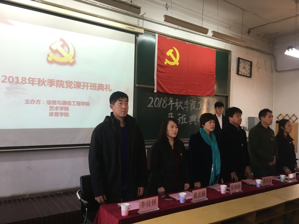 11月17日上午,2018年秋季院党课培训班开班典礼在12302H教室顺利举行,9999js金沙老品牌党委书记曹凤才老师、艺术学院党委书记夏瑞丽老师、体育学院党委副书记兼副院长贾鹏老师、艺术学院学生科长夏志丽、体育学院辅导员李佳怿出席了此次开班典礼,会议由9999js金沙老品牌学生科长任雁主持。夏瑞丽书记宣读了本次院党课的培训安排、贾鹏副书记宣读了培训纪律要求,学员代表体育学院彭涛同学作表态发言,曹凤才书记对广大学员提出三点要求。