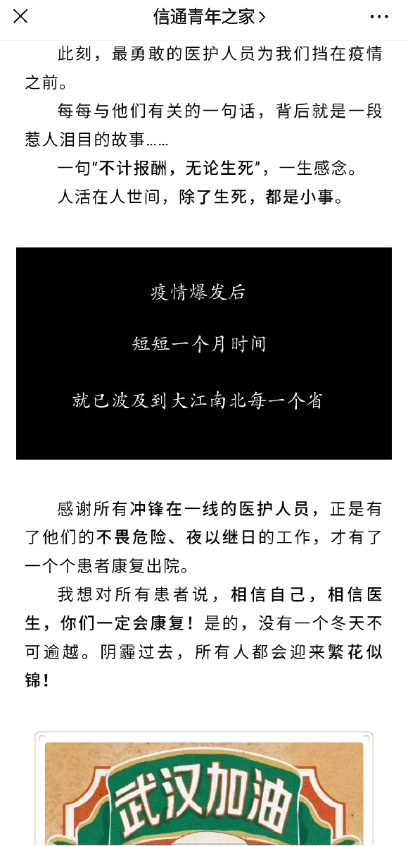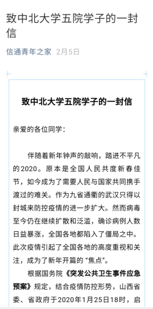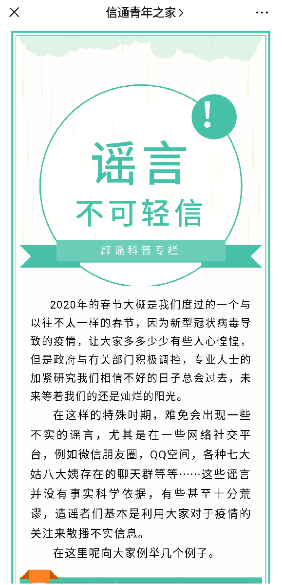 坚守网络科普阵地,筑牢抗疫思想防线。为引导学生在疫情期间能够科学防疫,正确发声,学院坚守网络阵地,第一时间在学院公众平台发布《致中北大学五院学子的一封信》,倡议全体学子做合理抗“疫”的践行者;开通辟谣科普专栏,让学生学会理性对待和辨识谣言,对谣言不轻信不传谣;及时将疫情的最新消息传达给学生,并且提醒学生做好防护措施,配合当地防疫工作顺利进行,全面筑牢抗疫思想防线。
