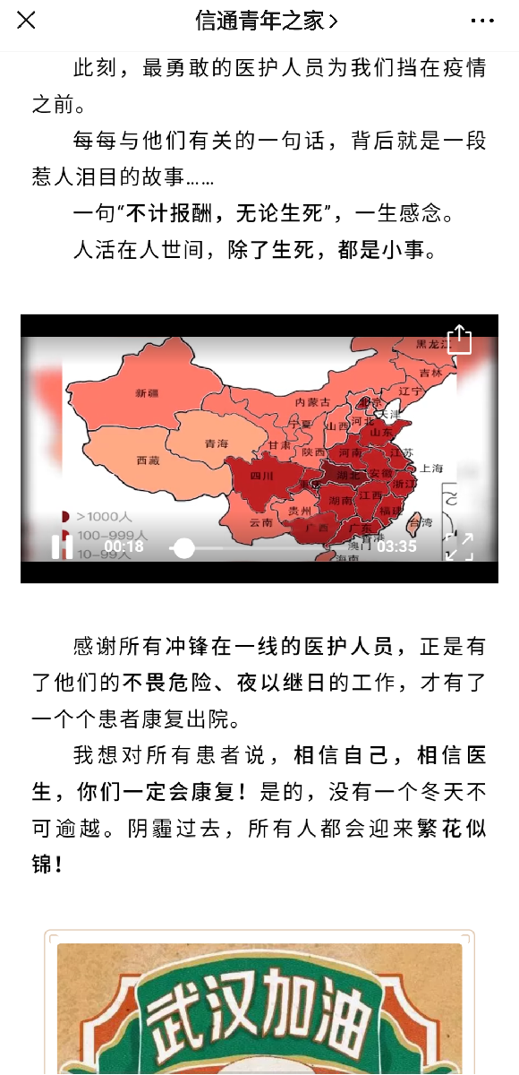 录制武汉加油视频,致敬最美医护人员。新冠肺炎疫情期间,9999js金沙老品牌不忘为国加油,联合全体学生以每个人讲一段为疫情加油的话的形式,加以剪辑,最终做出武汉加油视频,提醒大家勤洗手、戴口罩,共战疫情,共度难关。并希望以此作品致敬逆行者们,感谢他们夜以继日坚守岗位,守护人民,守护国家。