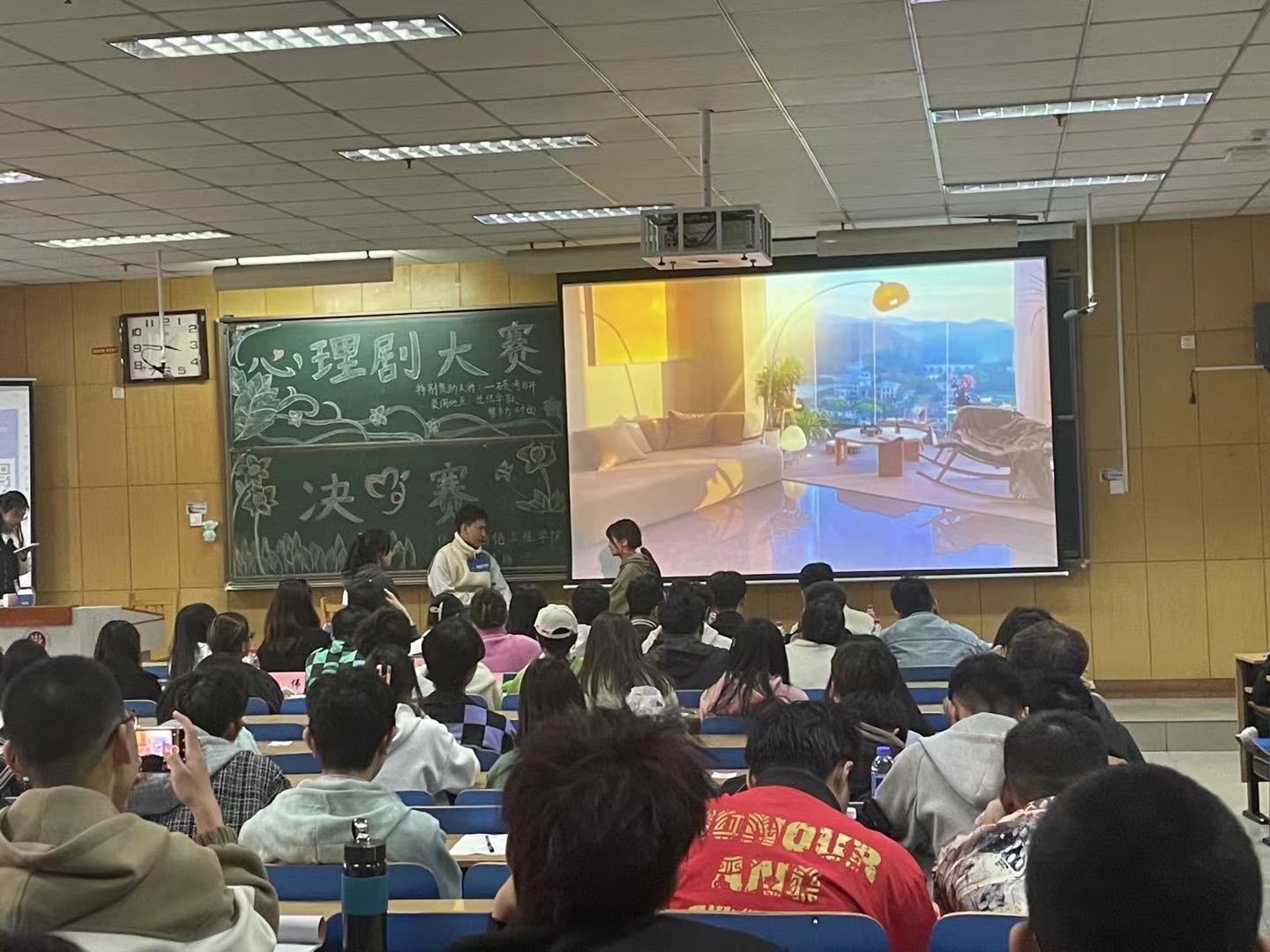 决赛现场,同学们通过“自己演、演自己”,将大学生日常生活与心理健康教育相融合,以大学生自我成长、追求梦想、网络暴力、人际关系等方面心理冲突为立足点,演绎出校园中常见的心理困惑及排解方法,表达质朴,感情真挚,引人深思,发人深省,引发了现场观众的强烈共鸣。     不同的剧目带来的不同的感受,其中《校园爱情》、《网络世界》、《面具人生》、《学习生活》、《家庭关系》这些剧目给观众们留下了深刻的印象。校园心理剧把学生在生活、学习、交往中的心理冲突、烦恼、困惑等,以小品表演、角色扮演、情景对话等方式编成“小剧本”进行表演,在剧中融入心理学的知识原理和技巧,有效提升学生心理健康成效。