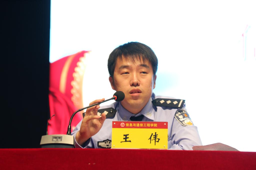 接着,王伟民警针对扫黑除恶专项斗争进行了动员。王警官提醒大家要谨防校园贷、校园欺凌等校园黑恶势力,并提供线索。王警官用诙谐幽默的语言为新生普及了扫黑除恶专项斗争的知识,起到很好的教育作用。