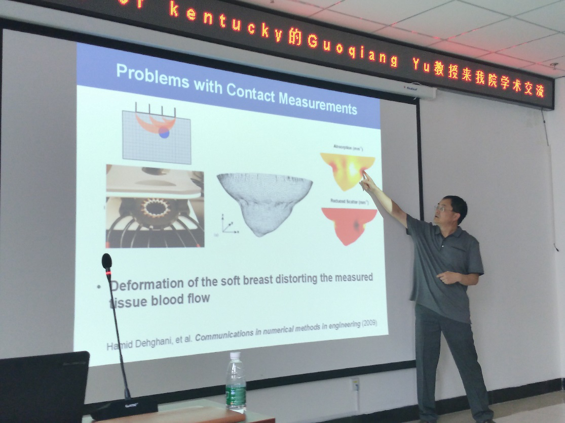 2018年7月20日上午9点,美国肯塔基大学终身教授、国际著名的生物医学工程专家Guoqiang Yu应中北大学生物医学成像与影像大数据山西省重点实验室的邀请,来我院进行了学术交流,并在学院715学术报告厅做了“非接触式近红外漫射光散斑组织血流成像技术”的学术报告。