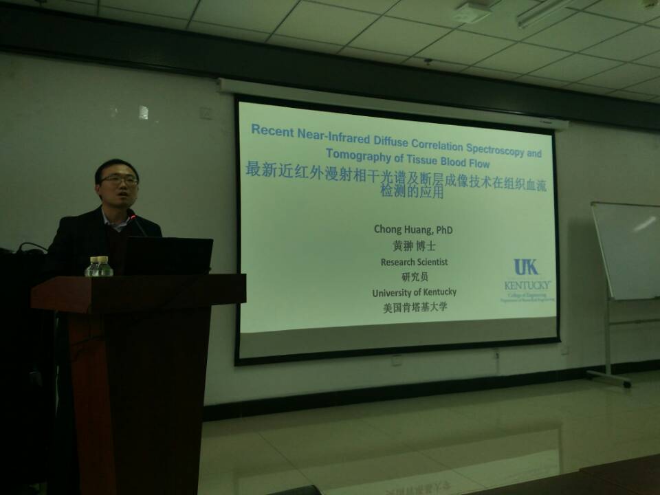 2018年11月14日下午3:30,美国肯塔基大学研究员黄翀博士应中北大学生物医学成像与影像大数据山西省重点实验室的邀请,来我院进行了学术交流,并在学院715学术报告厅做了“近红外漫射相干光谱及断层成像技术在组织血流检测的最新进展”的学术报告。