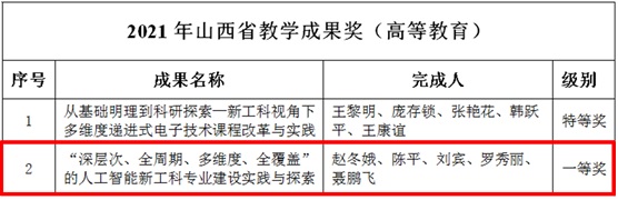 近日,山西省教育厅下发《关于公布2021年山西省教学成果奖获奖名单的通知》,人工智能专业教学改革《“深层次、全周期、多维度、全覆盖”的人工智能新工科专业建设实践与探索》斩获2021年山西省教学成果一等奖。